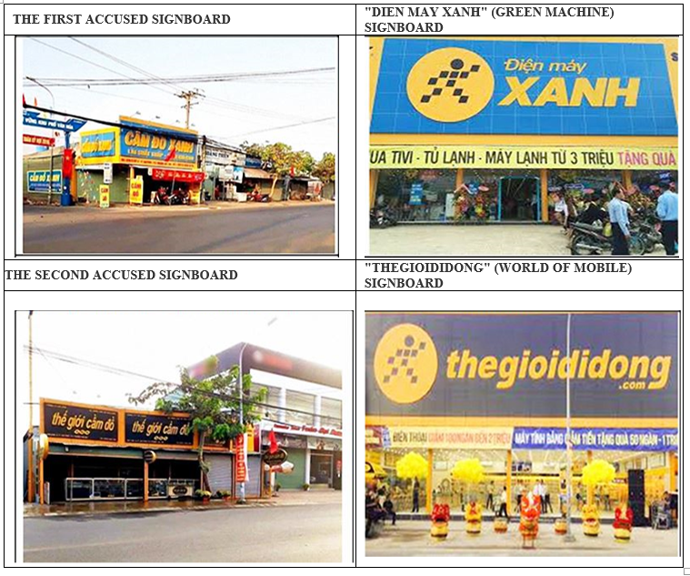 Therefore, there is no ground to tackle the subject of carrying out acts of advertising two suspicious signboards because: Green Pawn (Cam Do Xanh), World of Pawn (The Gioi Cam Do) are different from Dien May Xanh and Thegioididong.com respectively about structure and pronunciation, even though they all share or use "Green" (Xanh), "World" (The Gioi), outer edge in yellow and blue background.