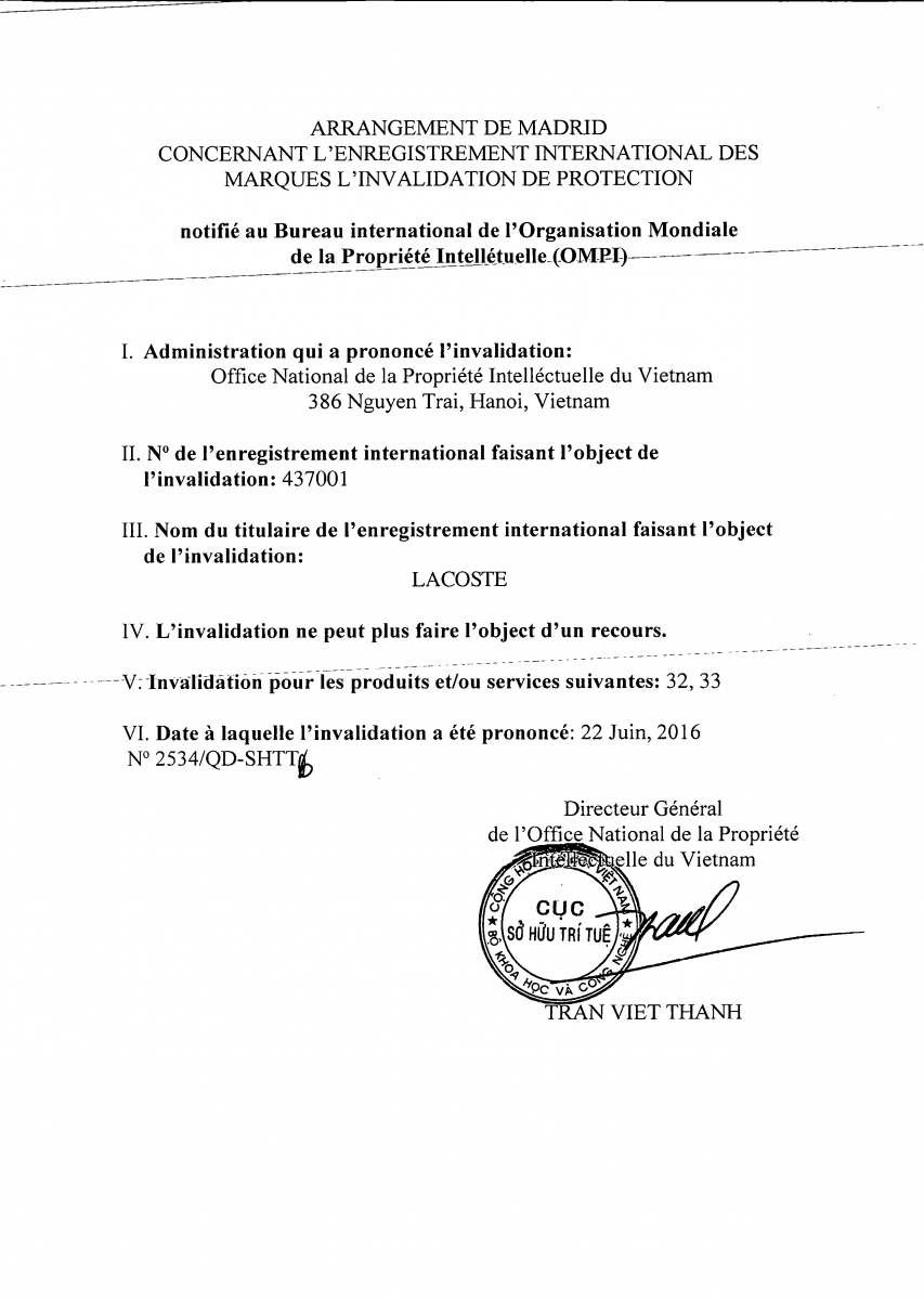 Picture of partial invalidation notice issued by the NOIP addressing the WIPO against IRN437001