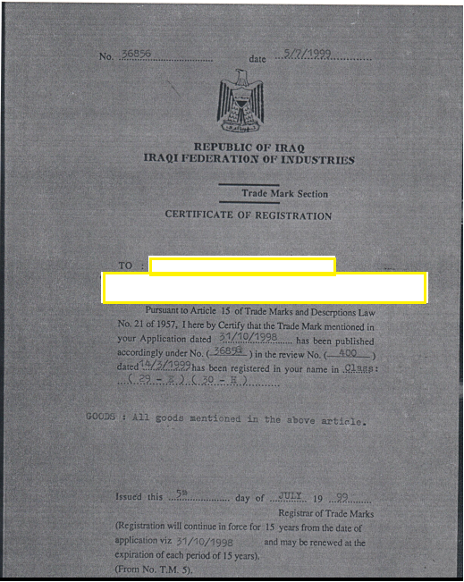 Ví dụ về đăng ký quốc tế nhãn hiệu được bảo hộ tại Iraq được đại diện bởi BROSS & Partners:
