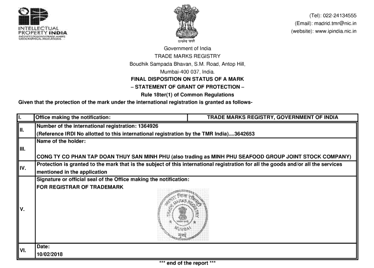 Dưới đây là mẫu tuyên bố cấp bảo hộ (statement of grant of protection) của Ấn Độ đối với nhãn hiệu đăng ký quốc tế Minh Phú do Bross & Partners làm đại diện pháp lý